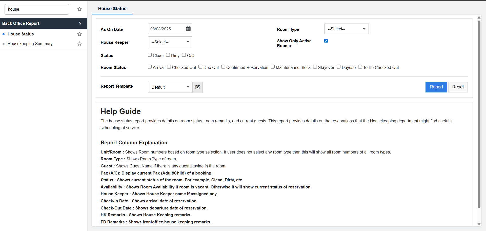 The Housekeeping Report now includes Frontdesk Remarks along with housekeeping remarks. This ensures every special request or instruction captured at the front desk is visible to the housekeeping team.